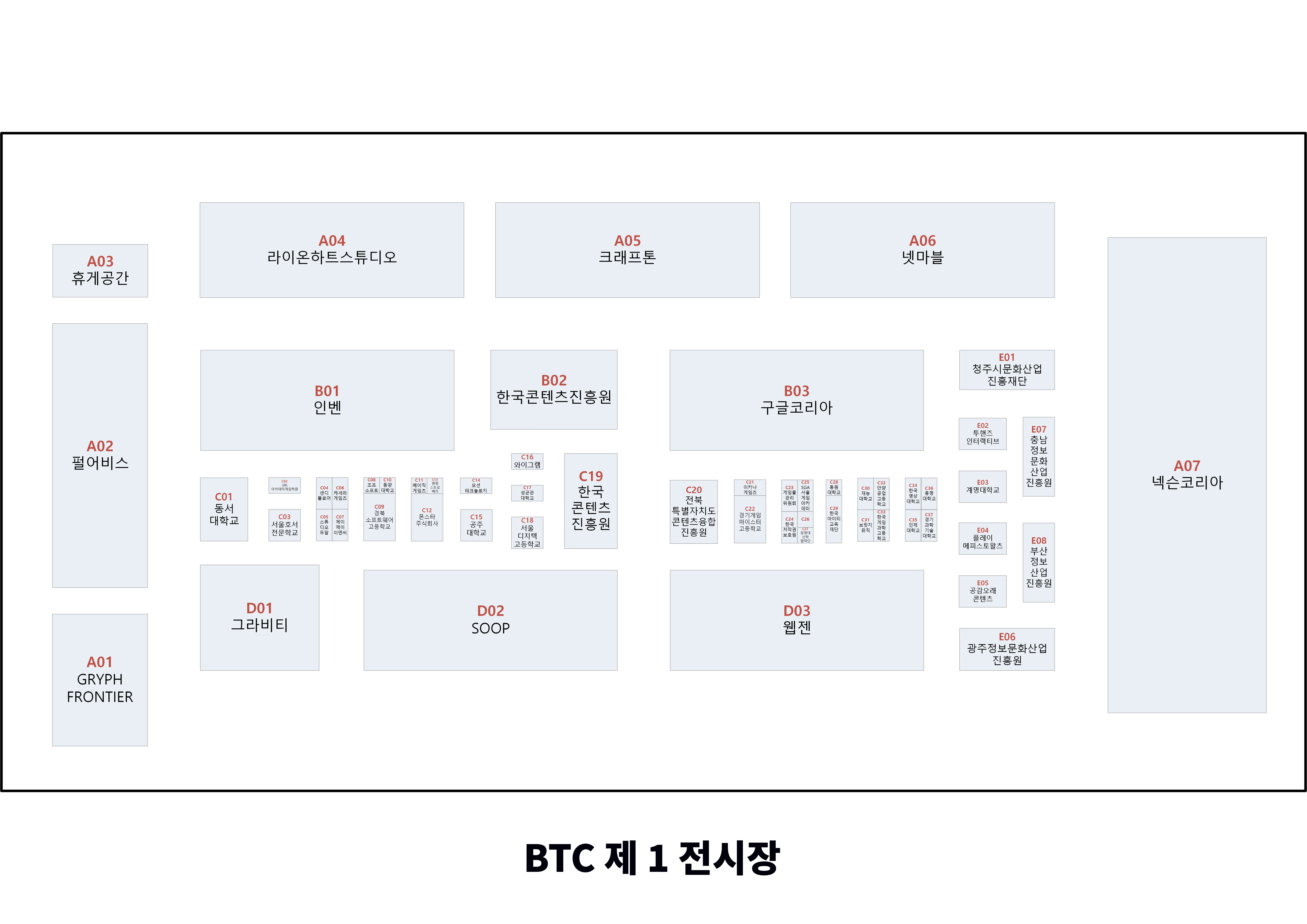 BTC 제1전시장에는 GRYPH FRONTIER, 펄어비스, 라이온하트스튜디오, 크래프톤, 넷마블, 넥슨코리아, 인벤, 한국콘텐츠진흥원, 구글코리아, 그라비티, SOOP, 웹젠 등이 참가합니다.