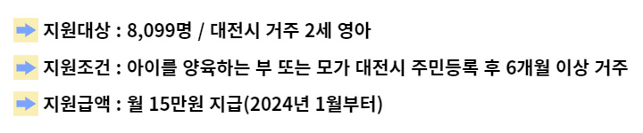 최근 부모급여가 올랐다는 기쁜 소식이 들렸었는데요. 0~1세까지만 지급해서 아쉬우셨을 2세 아이를 가진 부모님들에게 대전시에서 특별히 부모급여를 지급해 준다고 합니다. 대전시에 거주하는 2세 영아 8,099명을 대상으로 월 15만 원을 지급합니다. 지원 대상 아이를 양육하는 부모님이 대전시 주민등록 후 6개월 이상 거주해야만 지급받으실 수 있습니다.