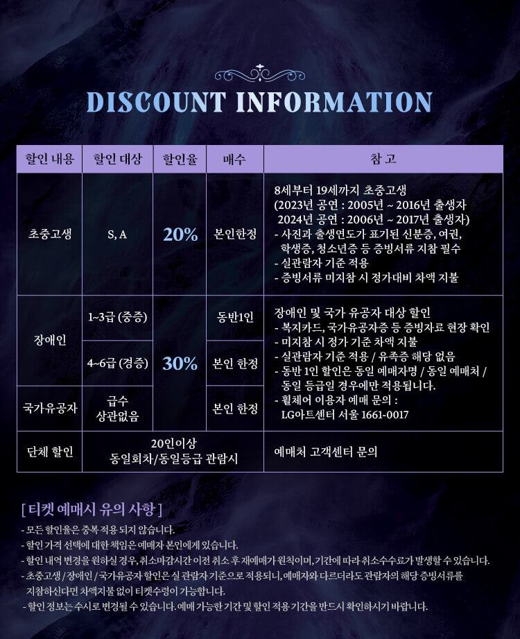- 티켓 할인 : 초중고생 20% 할인 / 장애인, 국가유공자 30% 할인 / 20인이상 단체할인(고객센터 문의) 이 적용됩니다.