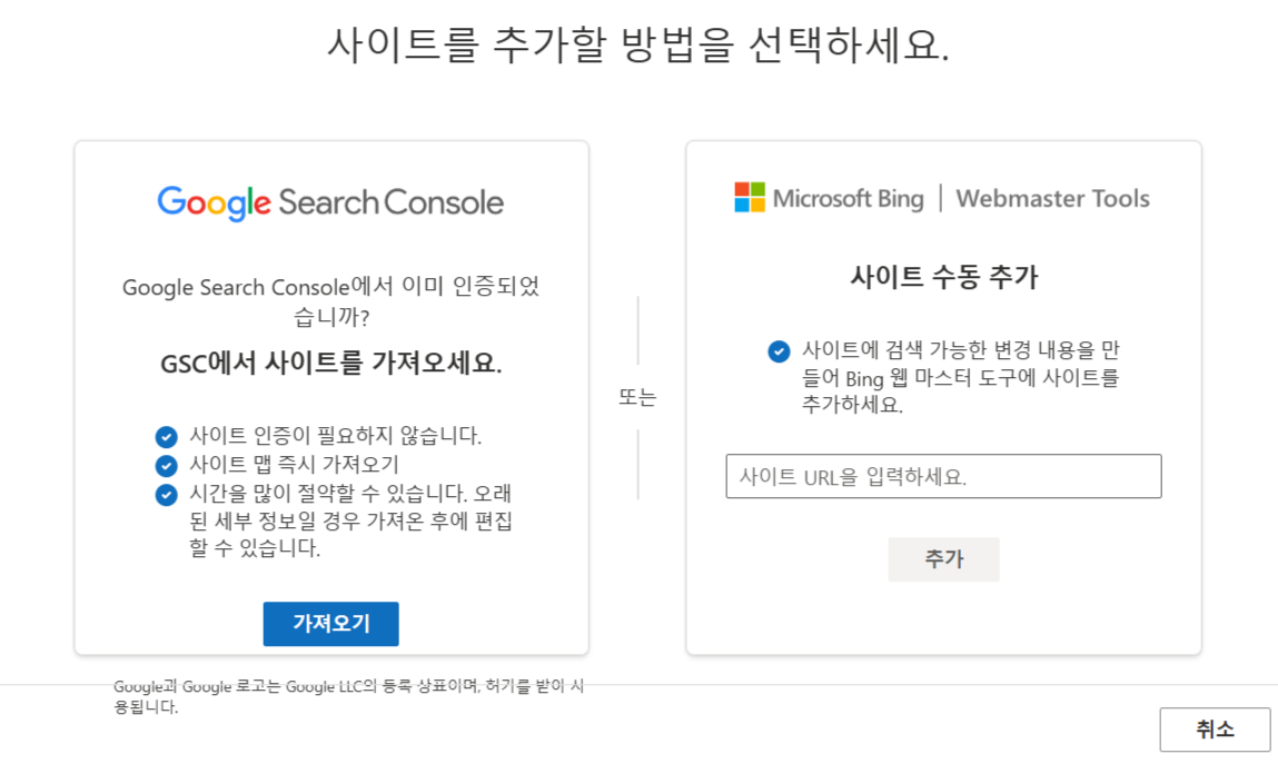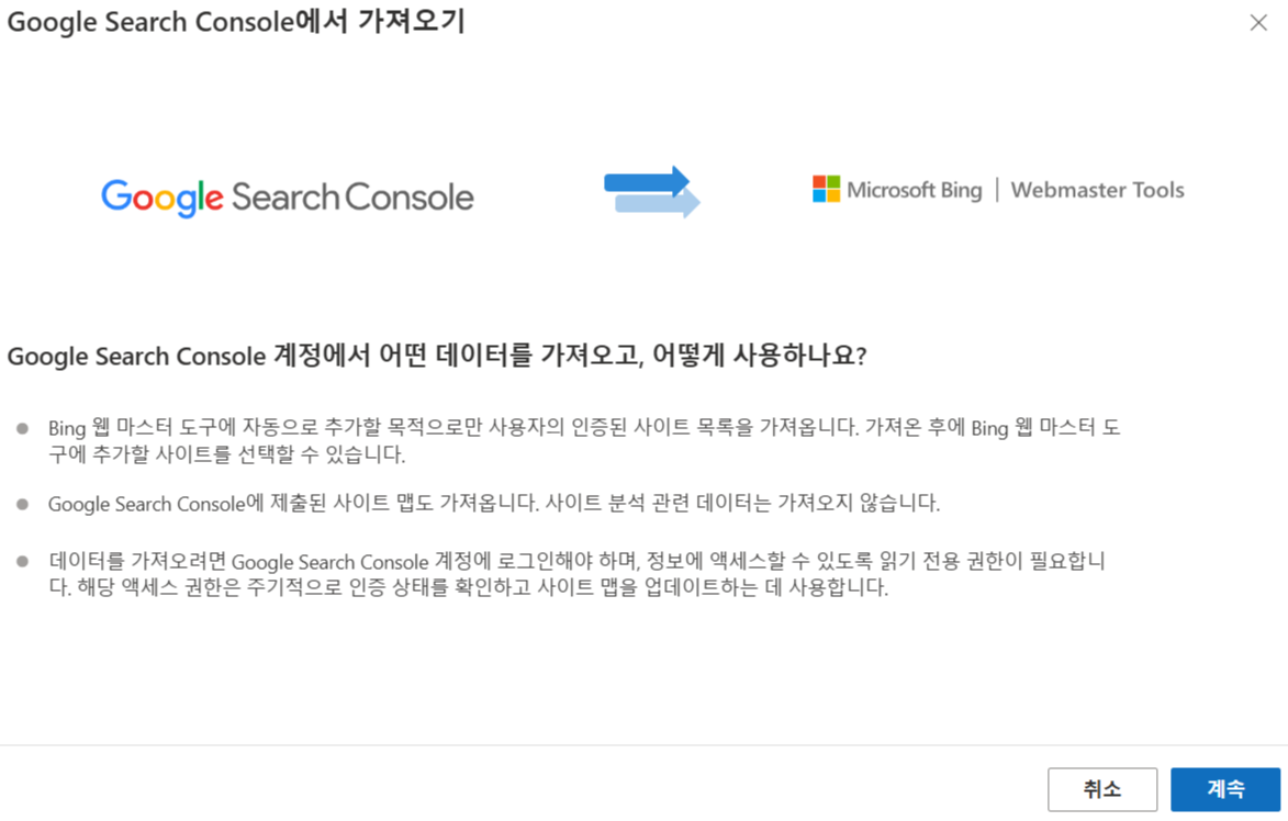 그러면 위와 같은 창이 뜨는데요. 왼쪽에 "GSC에서 사이트를 가져오세요" 창의 가져오기를 클릭합니다.