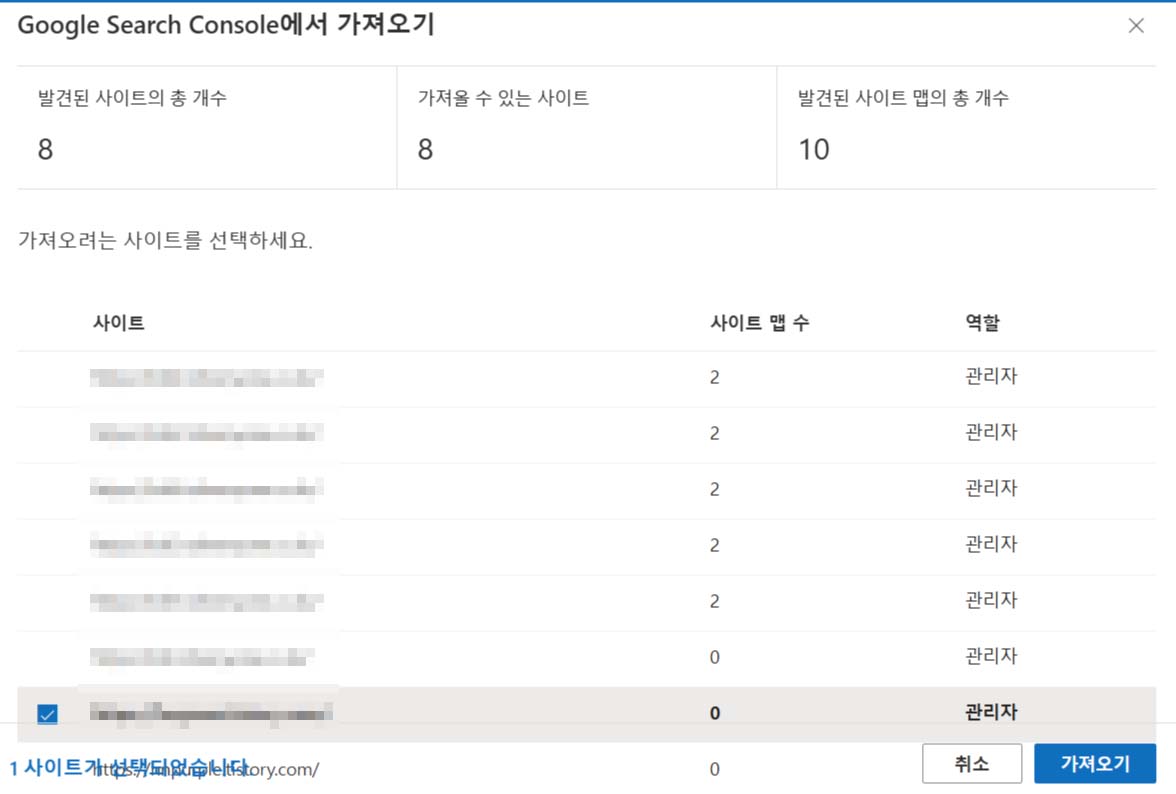 해당 사이트를 체크하고 '가져오기'를 누르면 축하합니다. 사이트를 추가하셨습니다.