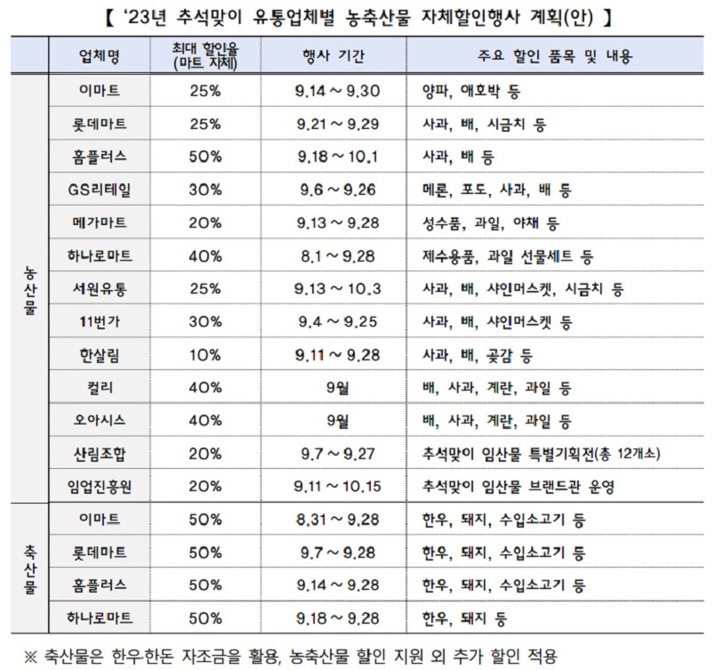 23년 추석맞이 마트별 농축수산물 할인행사 계획