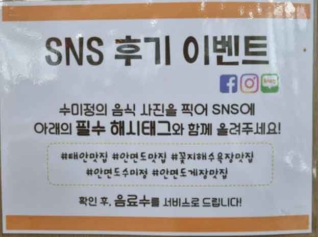 SNS 후기 이벤트도 하고 있어요. 음식 사진을 찍어서 인스타, 페이스북, 블로그 등에 필수 해시태그와 함께 올리면, 음료수를 서비스로 받을 수도 있습니다.