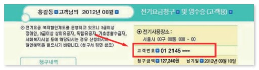 전기사용 계약단위별로 부여되는 고유번호로 전기요금 영수증 우측 상단에 표시되어 있으며 이를 통해 전기 사용 관련 정보를 제공받을 수 있습니다.