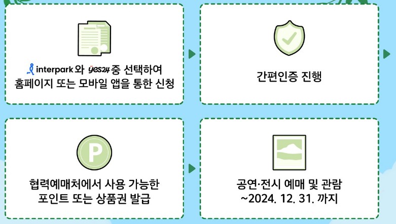 - 지급된 포인트 소진 시에는 본인부담금을 추가로 사용하여 예매 가능합니다.(인터파크 경우 카드 결제만 가능)