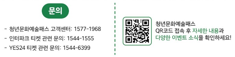 - 청년문화예술패스는 신청자 본인만 사용 가능하며, 동일회차 공연·전시는 1매만 예매 가능합니다.