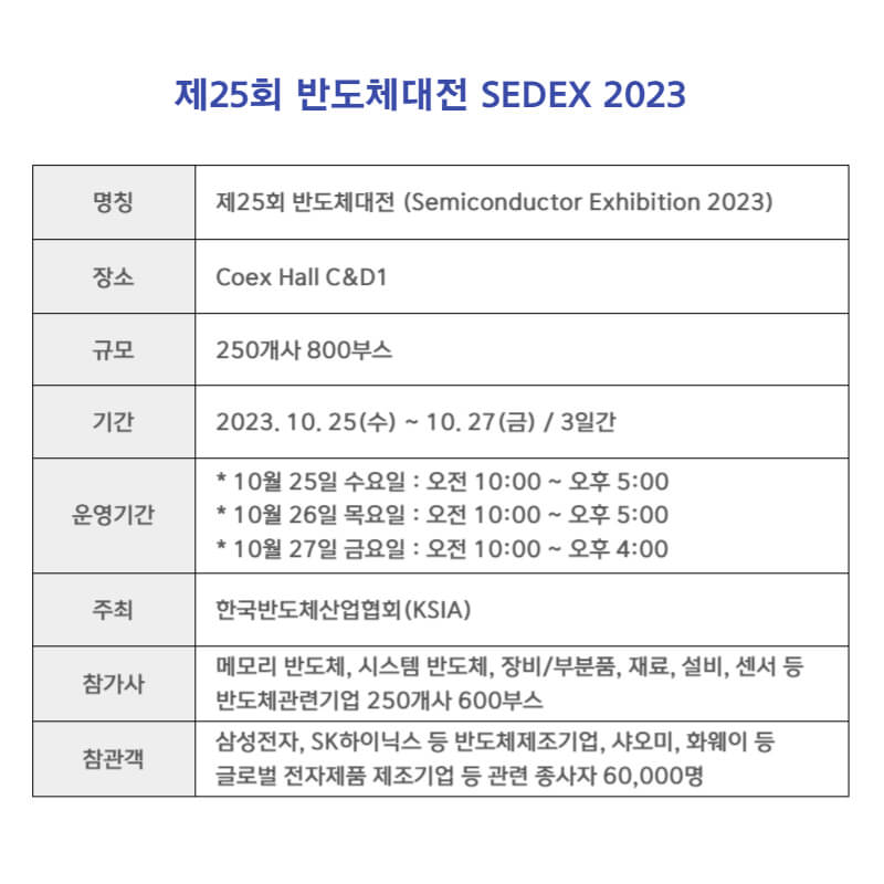 한국반도체산업협회(KSIA)가 주최하는 국내 최대 반도체 전문전시회인 "제 25 회 반도체 대전 SEDEX"가 2023년 10월 25일(수)에서 27일(금)까지 3일간 삼성동 코엑스에서 열립니다.