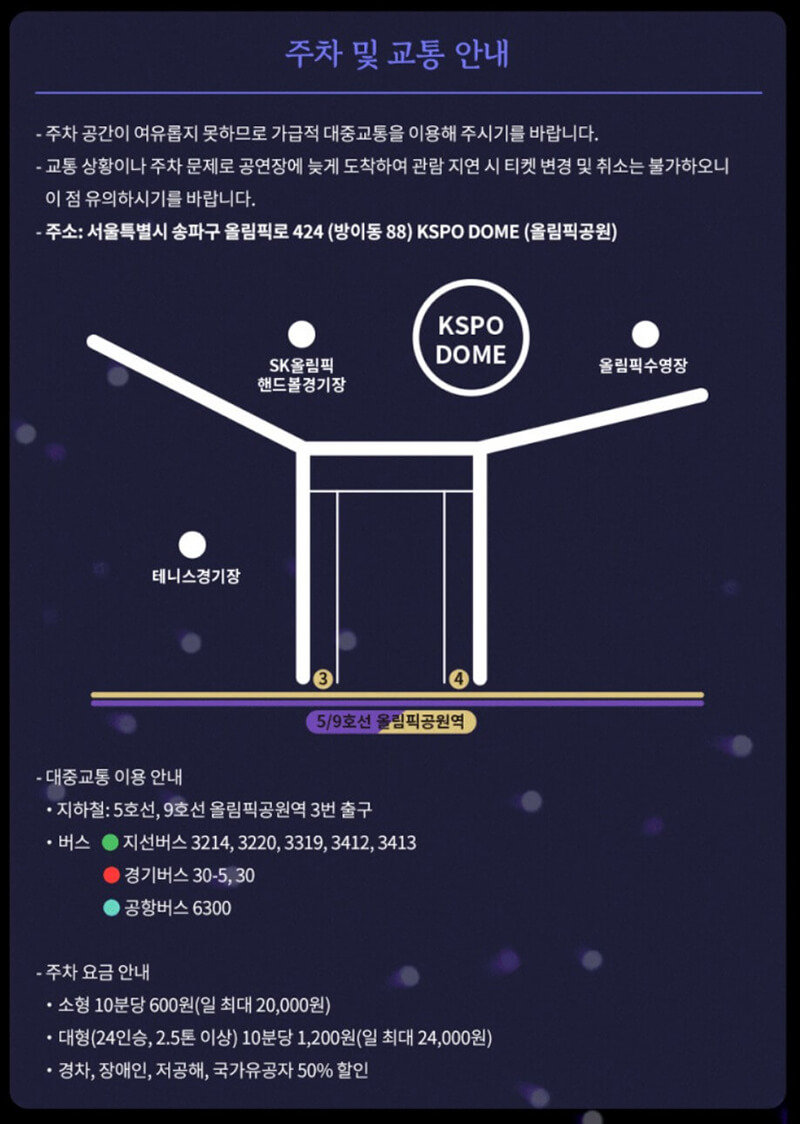 - KSPO DOME 주소 : 서울특별시 송파구 올림픽로 424 (방이동 88)