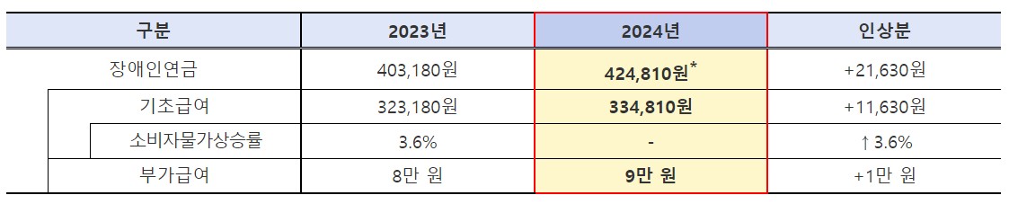 올해 1월부터 장애인연금이 작년보다 2만, 1,630원이 인상되었습니다. 2023년 소비자물가상승률 3.6%가 반영되어 11,630원이 인상된 기초급여 33만 4,810원에 1만 원 인상된 부가급여 9만 원을 합하면 월 최대 42만 4,810원 탈 수 있게 되었습니다.