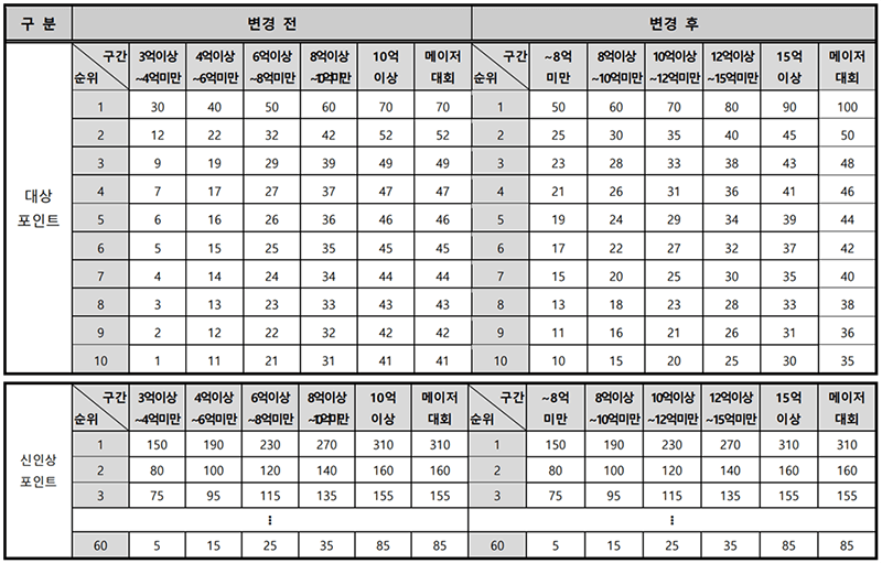 또한, 메이저대회는 독립적인 포인트가 부여되는 것으로 변경되어 메이저대회의 권위 향상과 차별화를 도모할 수 있게 되었습니다. 아래 표는 이번 시즌에 변경된 대상포인트와 신인상포인트 규정입니다.